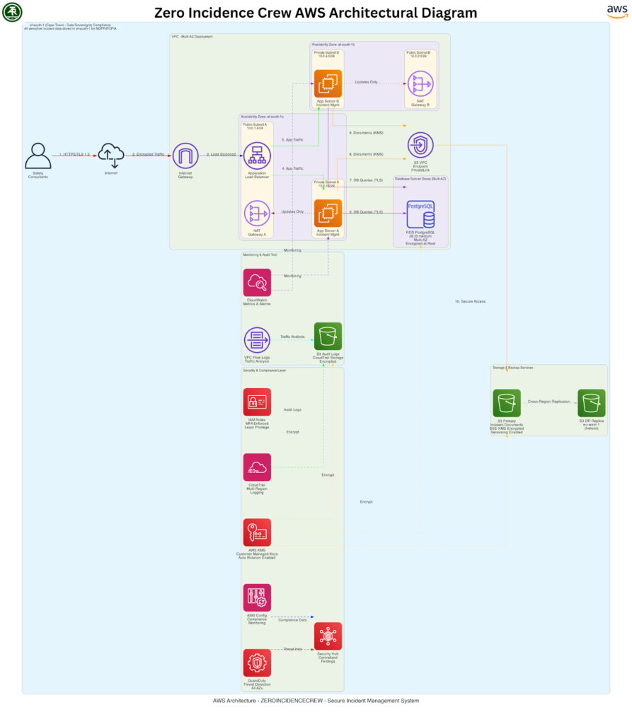 At the foundation, all data was encrypted at rest using AWS KMS customer-managed keys with automatic rotation, and in transit using TLS 1.3. Amazon RDS PostgreSQL with Multi-AZ deployment stored incident data with built-in encryption, while Amazon S3 with server-side encryption housed documents and evidence files.