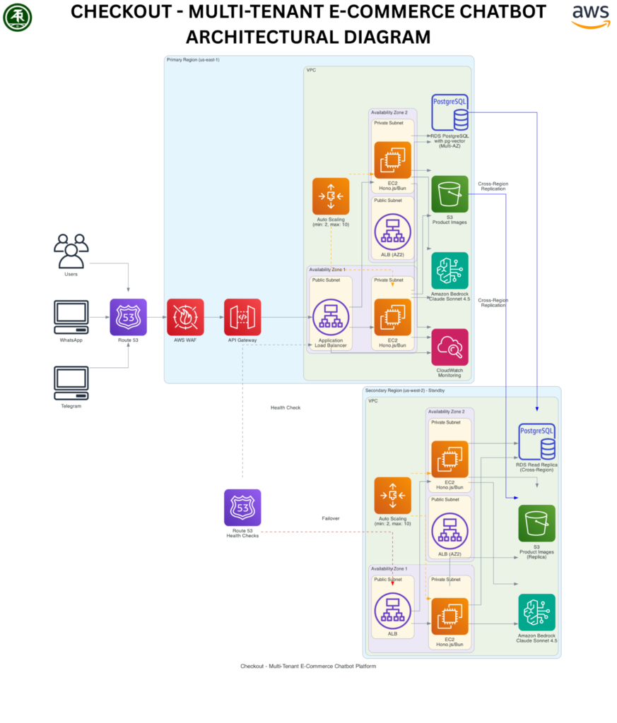 Checkout runs on production AWS infrastructure designed for the scale, reliability, and latency demands of real-time commerce. EC2 Auto Scaling ensures the platform handles 10,000+ concurrent users without performance degradation. Multi-region architecture delivers 99.9% availability across time zones.